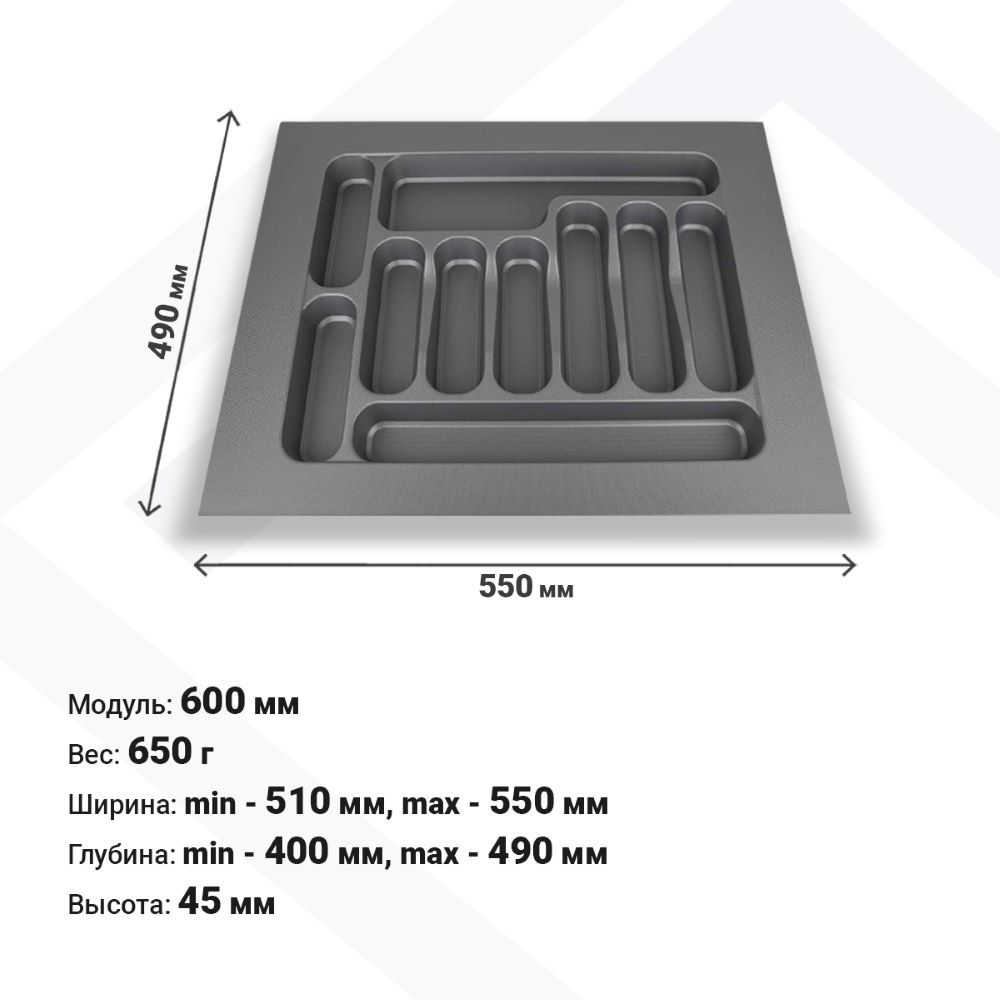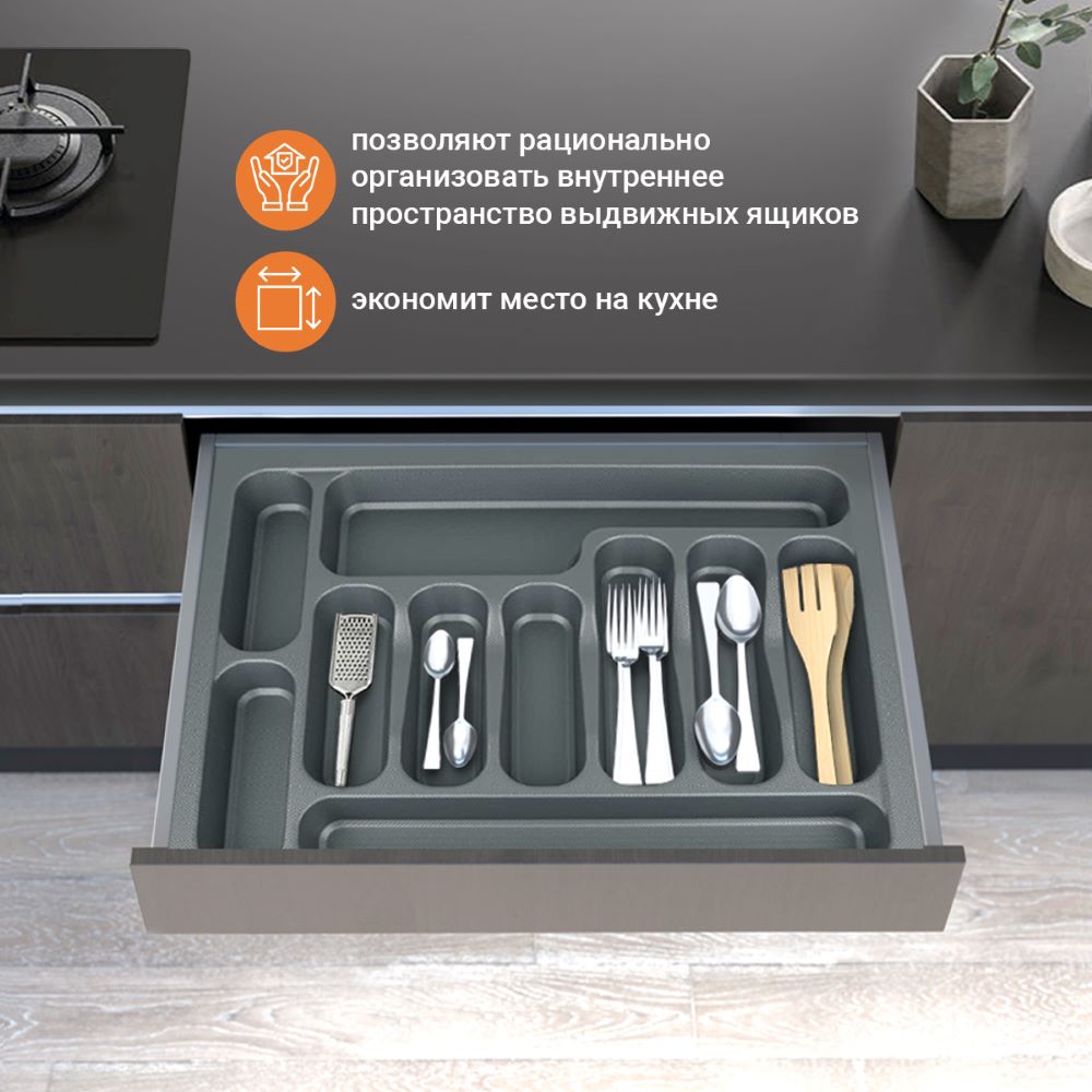 Лотки для столовых приборов EVA позволяют рационально организовать внутреннее пространство выдвижных ящиков. Цвета: серый и белый глянец. Для ящиков шириной 600 мм.